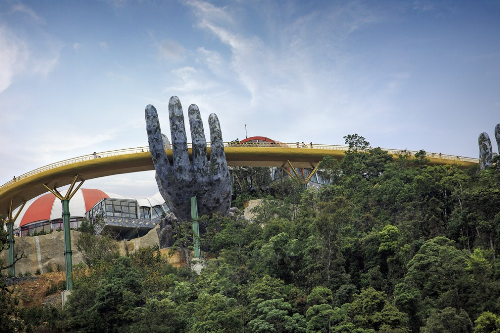 广州双狐越南签证资讯中心向大家介绍岘港的金桥,在岘港最高的山峰,越南是一座独特的设计桥梁。蜿蜒约150米,周围是盛开的鲜花,闪闪发光的金桥,靠在巴纳山上,巨手扶着。